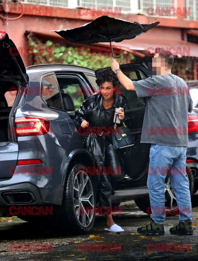 Până la urcarea în mașină, modelul a purtat o pereche de papuci albi specifici celor care sunt oferiți la cazare.