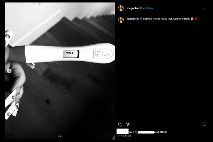 Pe rețelele de socializare, celebra actriță a încărcat două fotografii într-o singură postare. Prima imagine o înfățișează pe actriță, acoperită de un lichid negru, la o ședință foto, în timp ce arată cât de avansată este sarcina. În cea de-a doua imagine, actrița în vârstă de 38 de ani a arătat un test de sarcină pozitiv. În dreptul postării, Megan Fox a notat următorul mesaj: „Nimic nu este cu adevărat pierdut. Bine ai revenit!”. Există posibilitatea ca, prin intermediul mesajului respectiv, actrița să facă referire la sarcina pe care a pierdut-o în 2023.