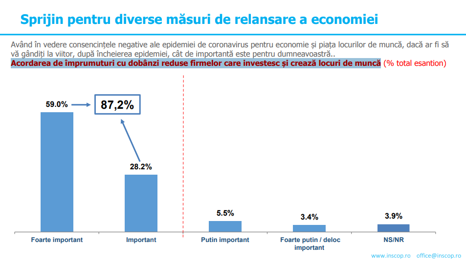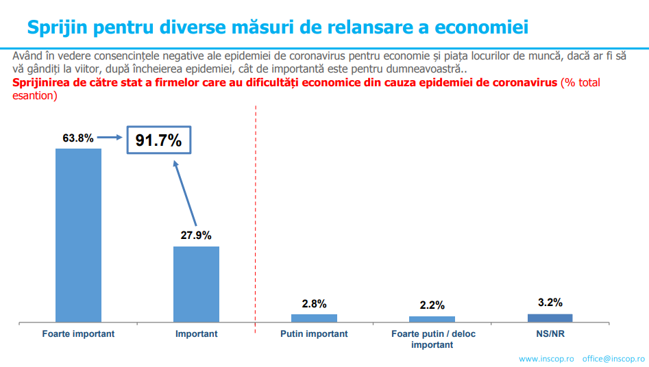 În contextul consecințelor negative ale epidemiei de coronavirus pentru economie și piața locurilor de muncă, 91,7% dintre respondenți apreciază ca fiind foarte importantă și importantă sprijinirea de către stat a firmelor care au dificultăți economice din cauza epidemiei de coronavirus (63,8% cred că e foarte important, iar 27,9% că e important), iar 93,6% ca fiind foarte importantă și importantă susținerea unor mari proiecte de investiții publice sau private în vederea stimulării economiei românești și creării de locuri de muncă (72% cred că e foarte important, iar 21,6% că e important).
