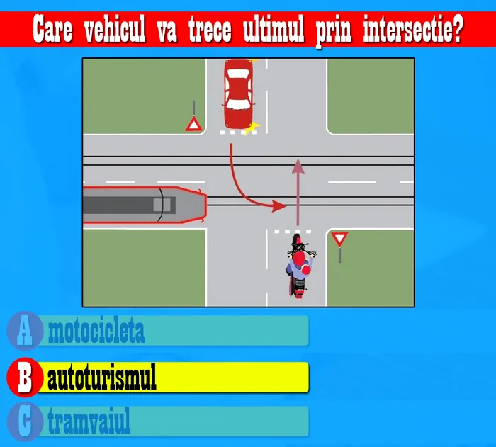 Test auto doar pentru șoferii cu experiență | Ce vehicul trece ultimul prin intersecție: motocicleta, autoturismul sau tramvaiul?