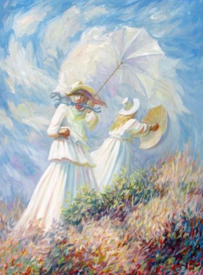 Cu zâmbetul pe buze și cu pumnul strâns peste umbrela luată de vântă, această femeie este plină de contradicții. Vântul amenință să îi smulgă umbrela din mâini, dar în loc să se sperie, ea are o expresie senină pe față. Însă, pumnii strânși sugerează că se simte încordată, deși râde de inconvenient.