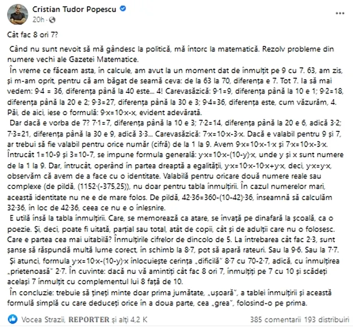 Pentru cei care nu știu, celebrul jurnalist Cristian Tudor Popescu este și un matematician înrăit, deci se poate juca lejer cu problemele de matematică. Trebuie să țineți minte doar prima jumătate, „ușoară”, a tablei înmulțirii și această formulă simplă cu care deduceți orice în a doua parte, cea „grea”, folosind-o pe prima, este sfatul lui CTP, mai ales pentru copiii care vor să stăpânească rapid și sigur materia.