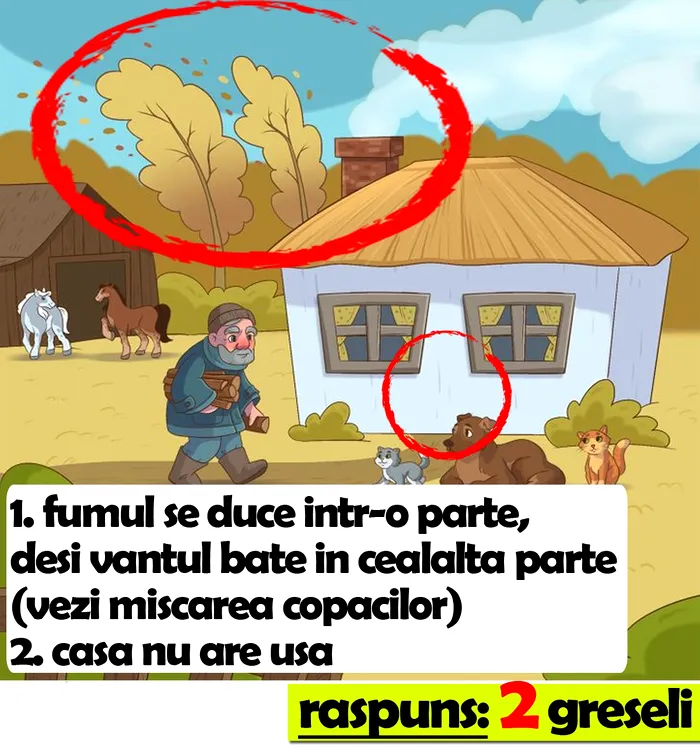 Dar câte greșeli sunt în imagine? Ei bine, sunt două greșeli, pe care o persoană atentă le identifică rapid: este vorba despre faptul că fumul care iese pe coșul casei merge într-o parte, deși vântul bate în cealaltă parte, după cum se poate vedea dacă ne uităm la copacii de lângă casă, cea de-a doua greșeală, ce-i drept, mai ușor de reperat, fiind lipsa ușii la casă.