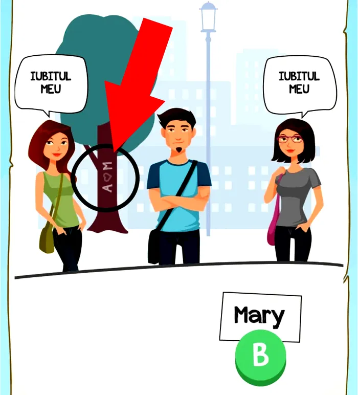 Dacă nu, răspunsul se află pe copacul din spate. Pe acesta sunt gravate inițialele celor doi iubiți: A+M, adică Adrian și Mary, astfel că Mary este iubita lui Adrian.