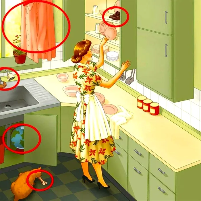 1. În dulapul în care femeia pune produse alimentare există o pereche de pantofi, care, evident, nu are ce căuta acolo;