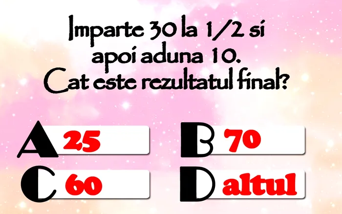 Împarte 30 la 1/2 și apoi adună 10. Care e rezultatul final?