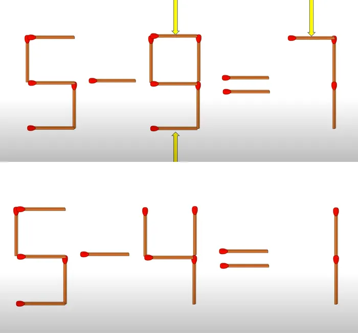 Pentru a obține o egalitate corectă, renunțăm la două bețe de chibrit din cifra 9 (cel de sus și cel de jos), transformând, astfel, 9 în 4. De asemenea, eliminăm și bățul de chibrit din partea de sus a cifrei 7, transformând-o, astfel, în 1.