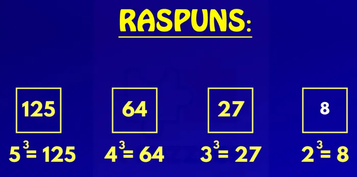 In seria 5,4,3, evident că urmează 2. Ridicându-l la cub, obținem: