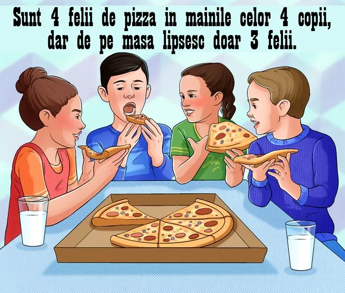 Dacă nu, vă ajutăm noi. Răspunsul este simplu: deși fiecare dintre cei patru copii mănâncă câte o felie de pizza, din cutia de pe masă lipsesc doar trei felii.