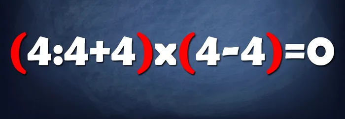 (4:4+4)x(4-4)=0. De ce? Este foarte simplu! Rezultatul primei paranteze este rezultatul 4:4+4, respectiv 1+4=5. Dacă efectuezi calculul celei de-a doua paranteze, ai 4-4=0. Astfel, calculul devine 5×0=0, iar egalitatea este corectă.