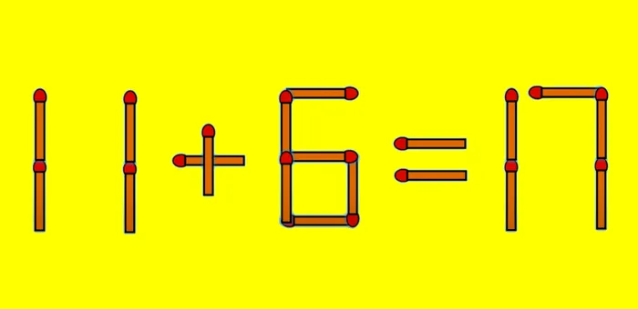 Dacă ai reușit să rezolvi ecuația, felicitări. Dacă nu ai reușit, te ajutăm noi cu răspunsul! După cum se știe, 17+6=11 este un exercițiu greșit! Tot ce trebuie să faci ca să rezolvi acest exercițiu este să muți un singur băț de chibrit. Care să fie oare? Ei bine, se ia bățul de la cifra 7 și se adaugă la cea de-a doua cifră de 1. Și astfel va rezulta: 11+6=17.