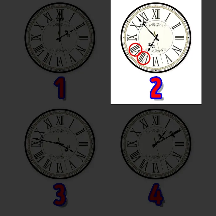Ați reușit? Dacă nu, vă spunem noi răspunsul. Ceasul cu numărul 2 arată de două ori ora 8, în loc să arate întâi ora 7.