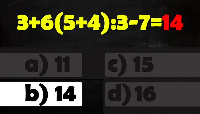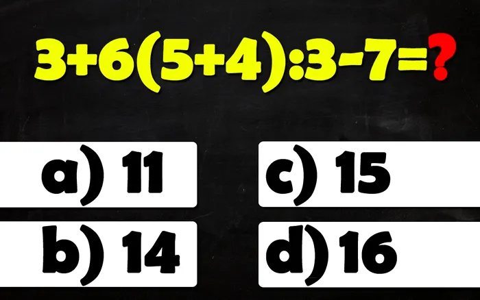 Un test de măsurare a coeficientului de inteligență, cu patru variante de răspuns. Cât face 3+6(5+4):3-7? Ai patru opțiuni pentru răspuns: a)11, b)15, c)14 și d)16.