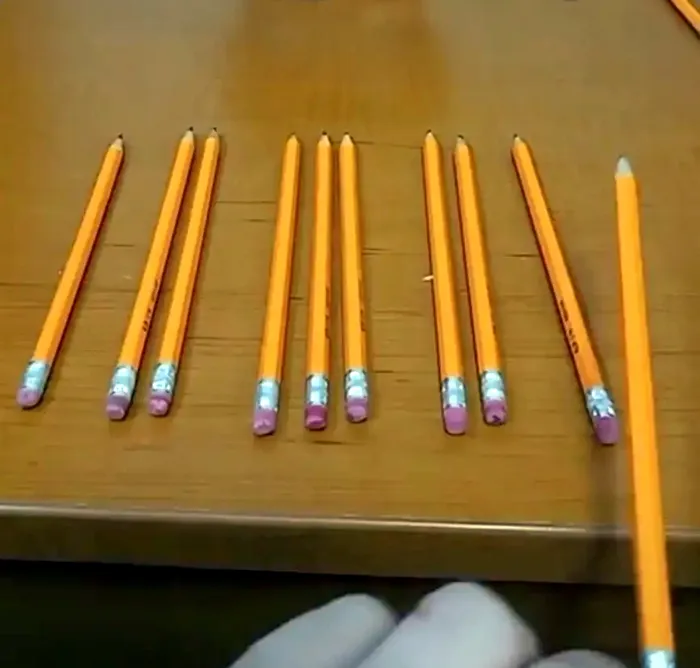 Grupul din stânga are patru creioane, apoi trei, o pereche de două și un singur creion.