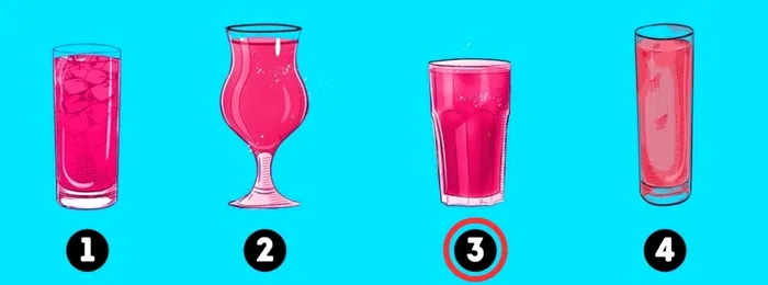 Al treilea pahar are o formă mai tradițională, cu înălțime medie și un corp mai larg, făcându-l să pară că ar putea conține o cantitate substanțială de lichid. Iar al patrulea este înalt și subțire, cu un aspect elegant. Înălțimea sa ar putea sugera o capacitate mai mare. Fiecare pahar are propriile sale caracteristici, ceea ce face dificil să se determine la prima vedere care dintre ele conține mai mult suc.