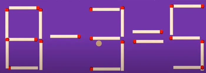 Vom lua bățul de chibrit care formează cifra șase și în vom adăuga la cifra 9 astfel încât să obținem imaginea cifrei 8. Avem, așadar, în loc de 9-3=6, 8-3=5.