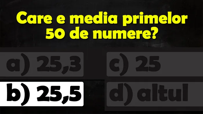 Așadar, media este: 1275/50 = 25,5 (răspuns corect: B)