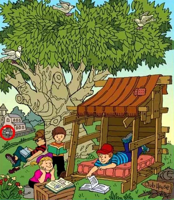 În primul rând, cel mai proeminent element reprezintă arborele. fiind urmat de construcția din lemn. Apar patru personaje care întreprind aceeași activitate, și anume lecturarea. În jurul celor patru copii se află alte elemente naturale, printre acestea regăsindu-se și un câine. Însă, unde să fie, oare?