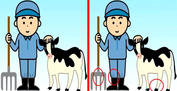 Numai cititorii cu abilități excelente de observare pot găsi trei diferențe între cele două fotografii cu un fermier și vaca sa, în doar 16 secunde.