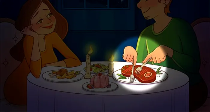 Cuplul se distrează și mănâncă preparate delicioase. Dar ai reușit să identifici greșeala din imagine? Vi se cere să priviți cu atenție imaginea, înainte de a răspunde la întrebare, deoarece răspunsul este destul de simplu, dar totodată complicat.