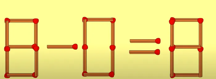 Se ia un băț de chibrit de la „+” și se adaugă la primul „0”, care se transformă în 8. Astfel, 8-0=8…