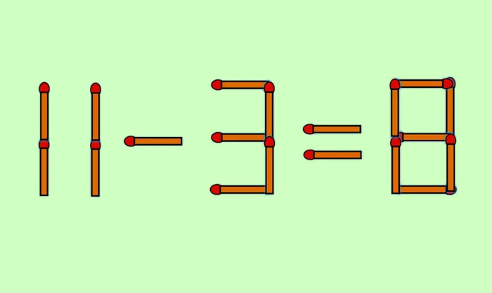 La o atenție sporită, se poate observa că trebuie să se mute un chibrit de la cifra „9”, transformându-se în „3”. Bățul de chibrit va fi mutat la rezultat, iar cifra „6” se va transforma în „8”. Astfel, vom avea: 11-3=8.