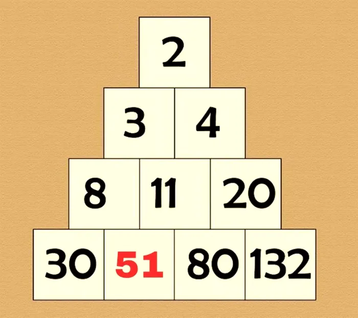Gândiți-vă la numerele din piramidă ca o succesiune: 2, 3, 4, 8, 11, 20, 30, ? , 80, 132.