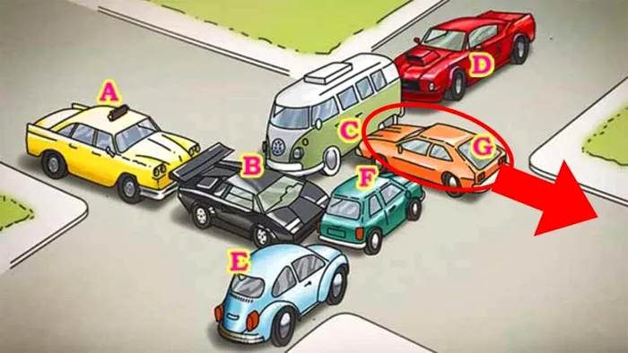 Tu ai reușit să-ți dai seama care este răspunsul corect? Dacă da, felicitări! Dacă ai ales G (mașina portocalie), ai făcut alegerea corectă! Este singura care, dacă e dată puțin înapoi, permite celorlalte mașini să se miște. Imediat ce aceasta se retrage, E și F pot avansa, apoi urmează A și B, și în cele din urmă C și G.