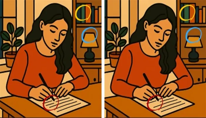 Privește cu atenție aceste două imagini cu o fată care scrie pe o hârtie. La început, s-ar putea să pară exact la fel, dar nu te lăsa păcălit! Există 3 mici diferențe ascunse între ele. Sarcina ta este să le găsești pe toate în doar 31 de secunde. Crezi că e ușor? Poate vrei să te gândești din nou – acest puzzle este mai dificil decât pare!