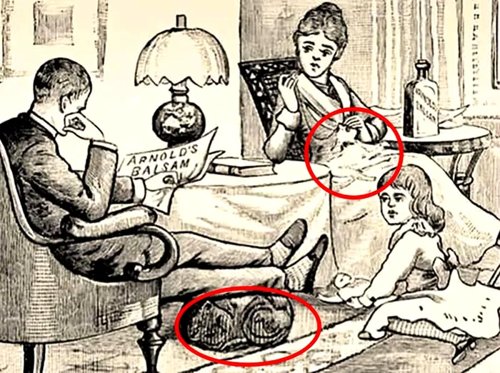 O imagine vintage cu o iluzie optică, distribuită mai sus, înfățișează o scenă dintr-o sufragerie în care un cuplu și fiica lor sunt văzuți petrecându-și timpul liber.