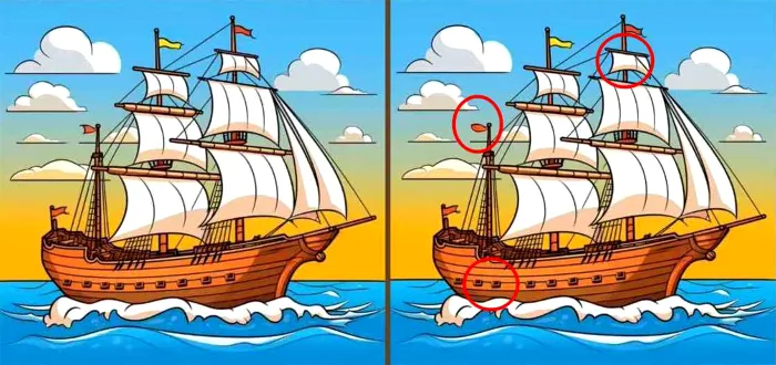 Imaginea de mai sus prezintă două imagini cu o navă navigând pe mare. Deși cele două imagini par identice, la prima vedere, ele nu sunt chiar așa.