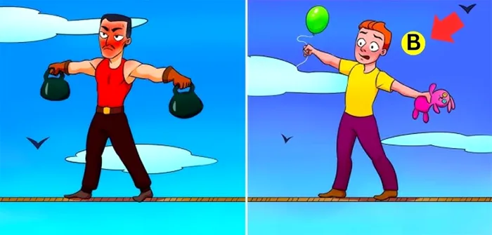 Dacă nu ați descoperit răspunsul corect, atunci noi vă sărim în ajutor. Primul bărbat are obiecte grele în ambele mâini, dar acestea sunt egale în greutate și îl ajută să își păstreze echilibrul. În cazul celui de-al doilea bărbat, deși obiectele sunt ușoare, nu au greutăți egale, motiv pentru care nu își va putea păstra echilibrul. Răspuns corect: bărbatul din cadranul B.