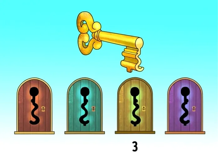 Avem o fotografie cu o cheie și patru uși. Întrebarea este „Care ușă poate fi deschisă cu cheia din imagine?”.