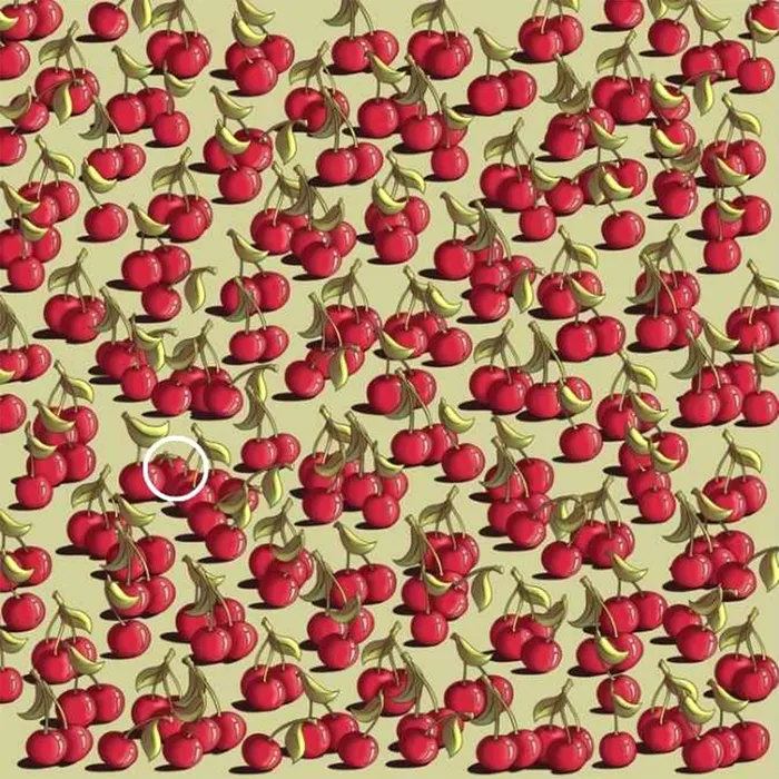 Provocarea este de a descoperi roșia ascunsă printre cireșele din această imagine. Cei care observă roșia într-un timp cât mai scurt demonstrează o claritate vizuală excepțională și un nivel ridicat de capacitate cognitivă.