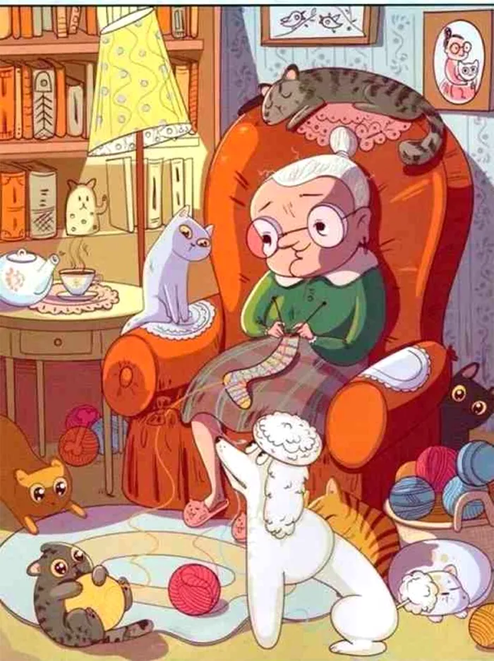 Astăzi, îți aducem un test intrigant. În imaginea de mai jos se află o bătrână în sufragerie cu animalele ei de companie. Undeva, în această sufragerie, se află un papion pierdut.