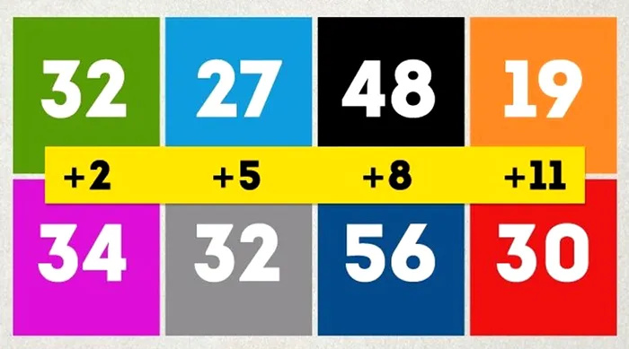 La o primă privire, cele 7 numere nu au nicio legătură unele cu altele. Există însă o asemănare. Să calculăm diferențele dintre cele două numere de pe fiecare coloană.
