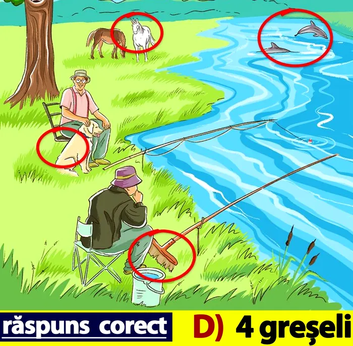 Ei bine, răspunsul corect este acela că în imagine sunt patru greșeli. Unul dintre pescari pescuiește cu… o mătură, celălalt stă pe un scaun care nu are picioare, iar ciudățeniile nu se opresc aici.