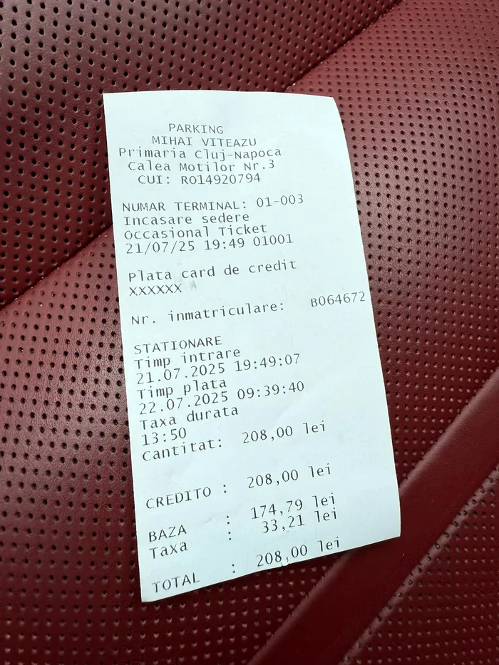 Prima pagină » Diverse » Turist, revoltat de suma plătită pentru un loc de parcare în Cluj-Napoca: „Tichet de plată parcare Cluj! Nu Dubai”