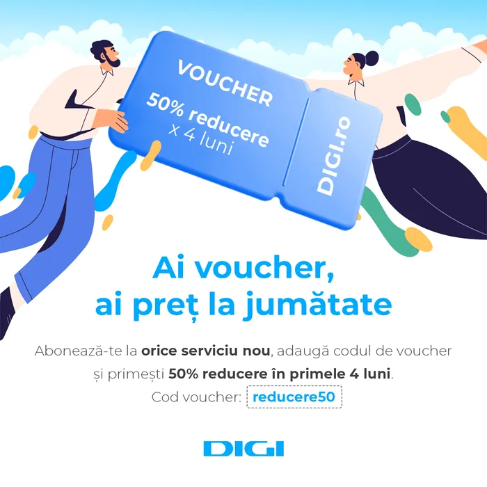 Comandă online orice serviciu nou și te bucuri de 50% reducere pentru primele 4 luni. 👉 Folosește codul de voucher reducere50 pentru a beneficia de promoție!”, transmit cei de la Digi.