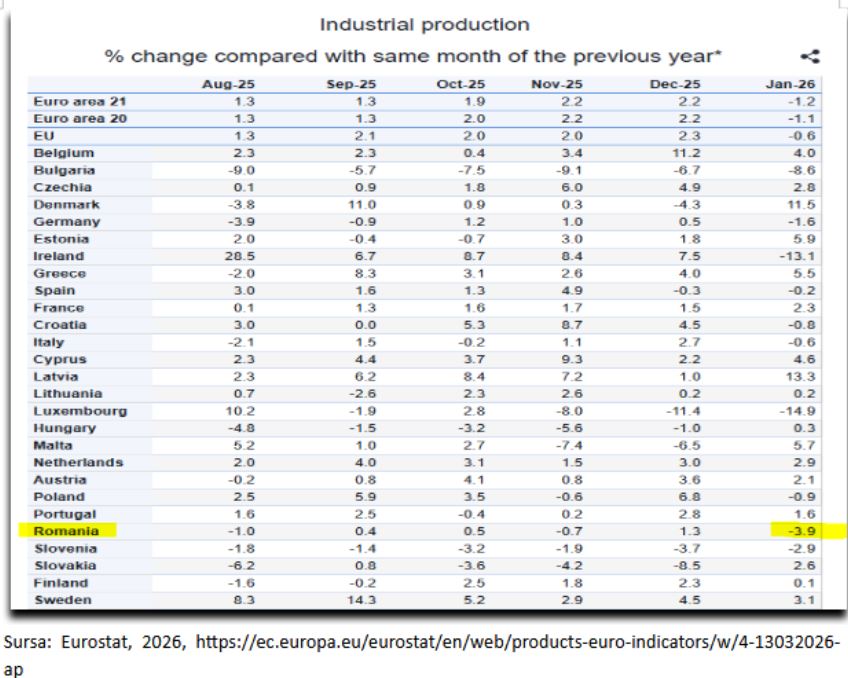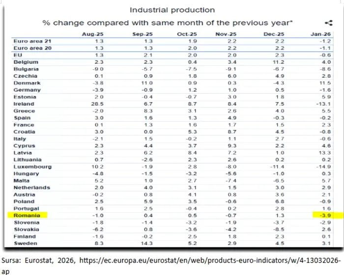 Prima lună a anului 2026 arată că România înregistrează a patra cea mai mare cădere a producției industriale din UE. Conform ultimelor informații furnizate de biroul european de statistică, poate fi observată o tendință descrescătoare a producției industriale în România. Scăderea este cu 3,9% în ianuarie 2026, arată MEDIAFAX. Datele pot fi consultate în graficul de mai jos.