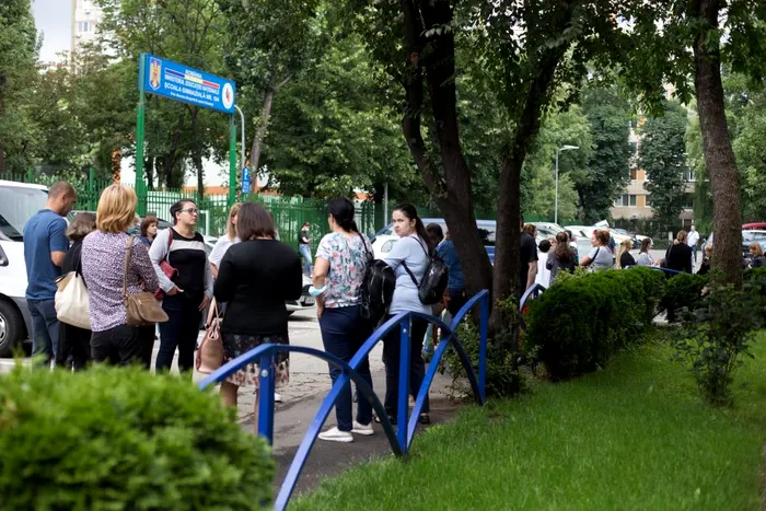 Foto: Părinții emoționați își așteaptă copiii la intrarea în școală