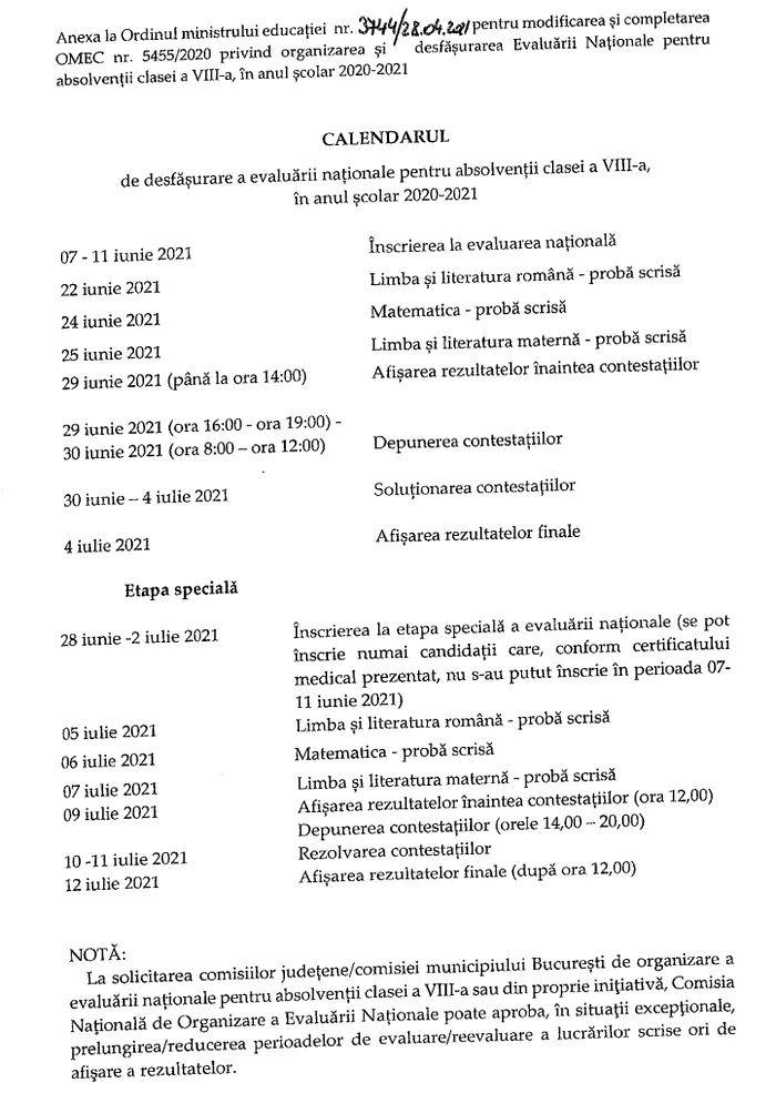 – 07 – 11 iunie 2021- Înscrierea la evaluarea națională;