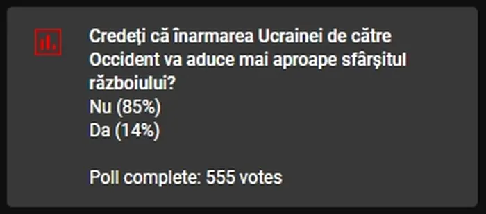 85% dintre cei care au răspuns nu sunt de părere că acest lucru va aduce semne de pace, în timp ce 14% cred că exact înarmarea Ucrainei de către Occident va aduce mai aproape sfârșitul războiului cu Rusia.