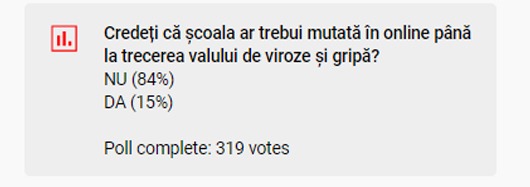 Ei bine, cei mai mulți nu ar fi de acord cu o asemenea măsură (84%), pe când 15% consideră că școala ar trebui mutată în online până la trecerea valului de viroze și gripă.