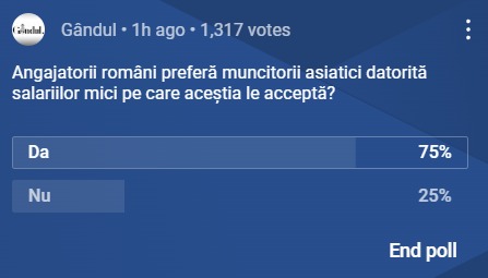 Credeți că „angajatorii români preferă muncitorii asiatici datorită salariilor mici pe care aceștia le acceptă?”. Așa a sunat întrebarea poll-ului din această seară, la emisiunea „Marius Tucă Show”.
