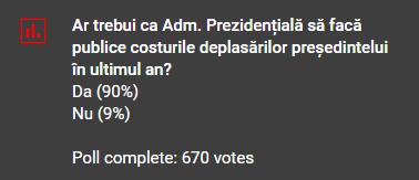 POLL Marius Tucă Show: „Ar trebui ca Administrația Prezidențială să facă publice costurile deplasărilor președintelui, în ultimul an?”