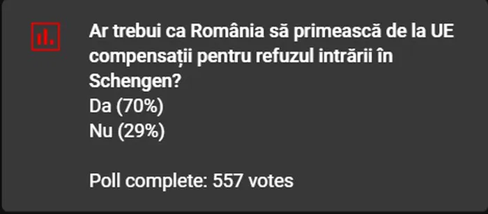 Iar răspunsurile au fost clare: 70% dintre telespectatori sunt convinși de acest lucru și doar 29% cred că România nu ar trbui să primească de la Uniunea Europeană (UE) compensații pentru refuzul intrării în Schengen.