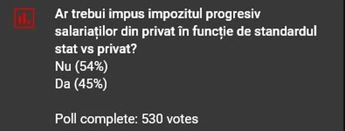 Iată întrebarea de la poll-ul emisiunii „Marius Tucă Show” de marți, 25 aprilie 2023: „Ar trebui impus impozitul progresiv salariaților din privat, în funcție se standardul stat versus privat?”.