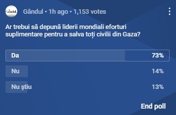 Telespectatorii emisiunii „Marius Tucă Show” au fost întrebați, în ediția de joi, 16 noiembrie, dacă ei consideră „că liderii mondiali ar trebui să depună eforturi suplimentare pentru a salva toți civilii din Gaza”…