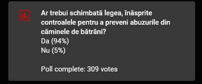 În contextul anchetei în cazul bătrânilor umiliți la un azil din Ilfov, întrebarea de la poll-ul emisiunii „Marius Tucă Show” de marți, 4 iulie, a fost următoarea: „Ar trebui schimbată legea și înăsprite controalele pentru a preveni abuzurile din căminele de bătrâni?”. Răspunsul afirmativ a fost unul categoric, în seara asta.